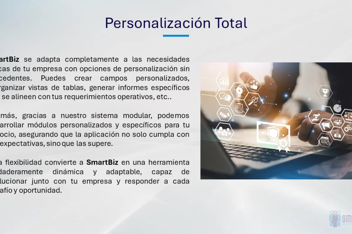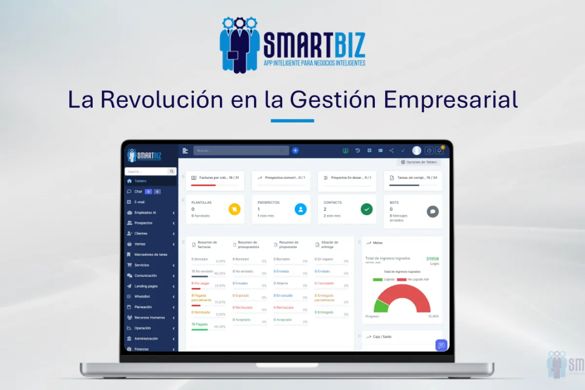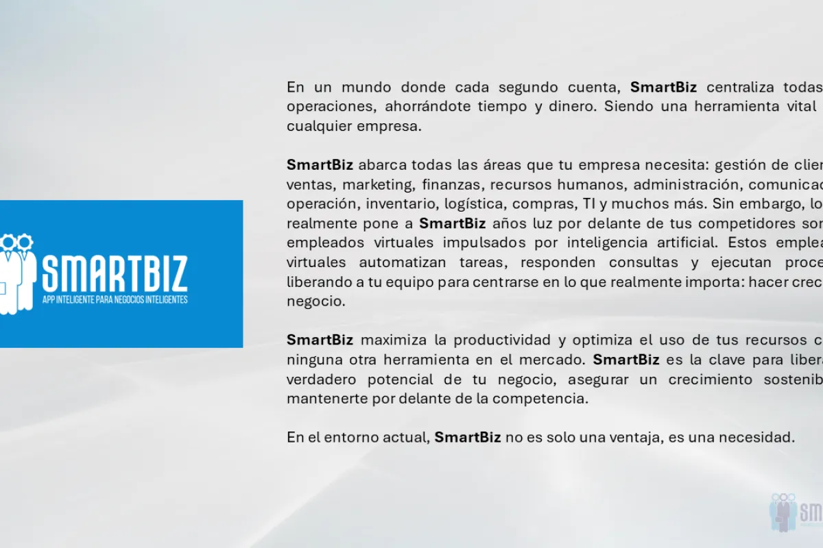 SmartBiz es la única plataforma empresarial que agrupa ERP, CRM, e-commerce, CMS, aplicación móvil e inteligencia artificial en un único entorno 100 % personalizable.